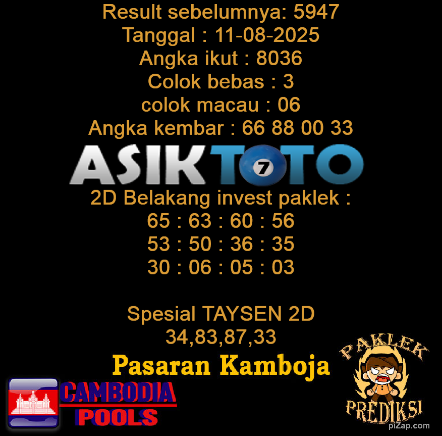 Prediksi Togel Asiktoto Cambodia 11 Agustus 2025. Togel Asiktoto adalah salah satu motode peracikan angka togel melalui rumus dari para master prediksi yang ada. Prediksi togel membantu para pecinta permainan togel untuk menebak angka result togel yang akan keluar.