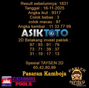 Prediksi Togel Asiktoto Cambodia 16 November 2025. Togel Asiktoto adalah salah satu motode peracikan angka togel melalui rumus dari para master prediksi yang ada. Prediksi togel membantu para pecinta permainan togel untuk menebak angka result togel yang akan keluar.