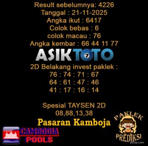 Prediksi Togel Asiktoto Cambodia 21 November 2025. Togel Asiktoto adalah salah satu motode peracikan angka togel melalui rumus dari para master prediksi yang ada. Prediksi togel membantu para pecinta permainan togel untuk menebak angka result togel yang akan keluar.