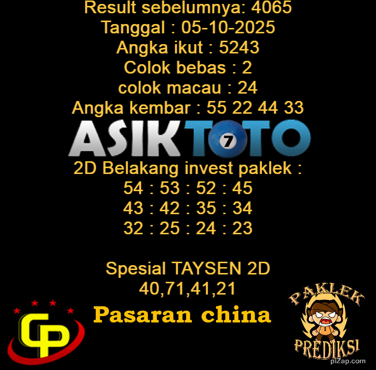 Prediksi Togel Asiktoto China 05 Oktober 2025. adalah salah satu motode peracikan angka togel melalui rumus dari para master prediksi yang ada. Prediksi togel membantu para pecinta permainan togel untuk menebak angka result togel yang akan keluar