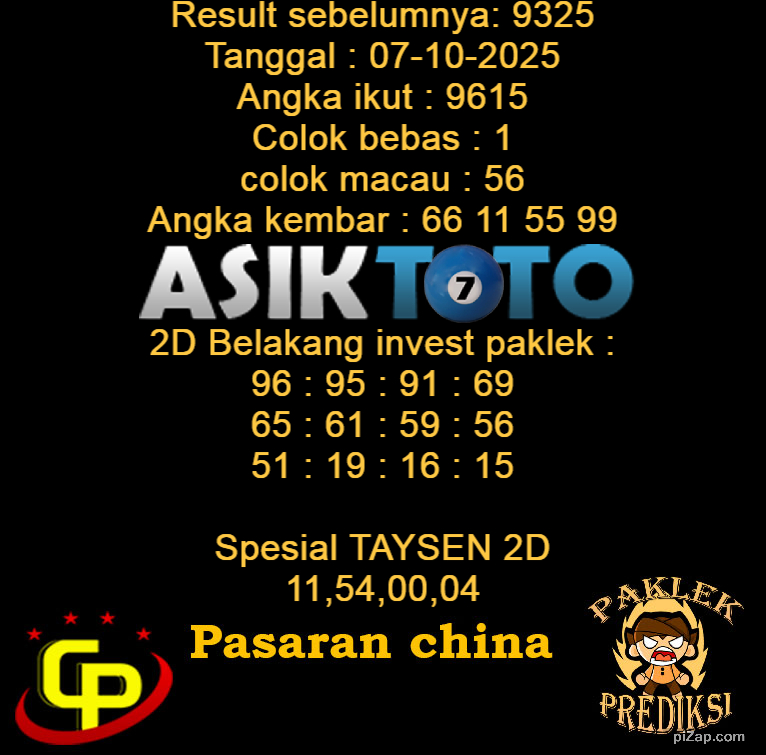 Prediksi Togel Asiktoto China 07 Oktober 2025. adalah salah satu motode peracikan angka togel melalui rumus dari para master prediksi yang ada. Prediksi togel membantu para pecinta permainan togel untuk menebak angka result togel yang akan keluar