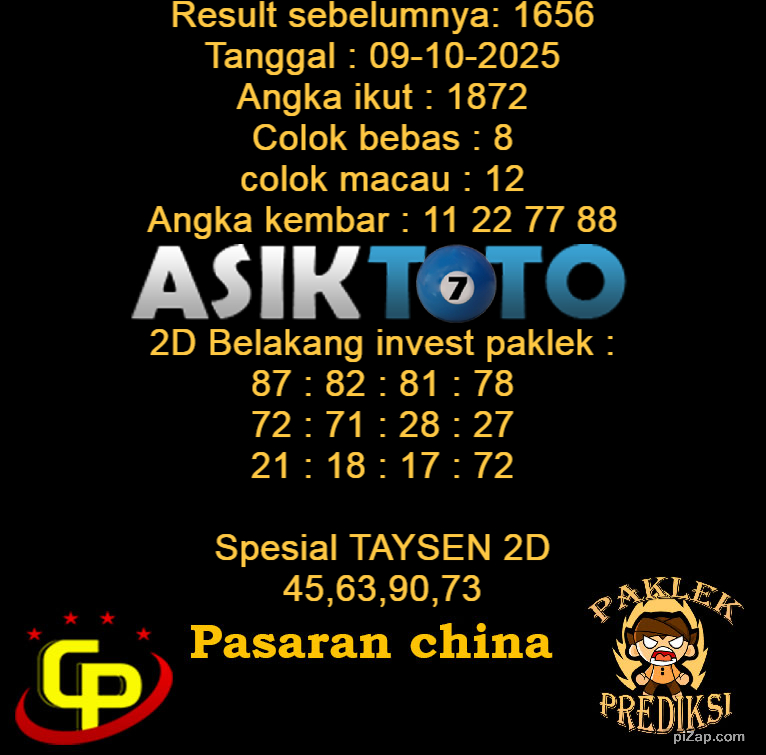 Prediksi Togel Asiktoto China 09 Oktober 2025. adalah salah satu motode peracikan angka togel melalui rumus dari para master prediksi yang ada. Prediksi togel membantu para pecinta permainan togel untuk menebak angka result togel yang akan keluar