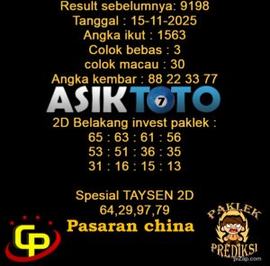 Prediksi Togel Asiktoto China 15 November 2025. adalah salah satu motode peracikan angka togel melalui rumus dari para master prediksi yang ada. Prediksi togel membantu para pecinta permainan togel untuk menebak angka result togel yang akan keluar