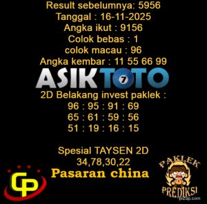 Prediksi Togel Asiktoto China 16 November 2025. adalah salah satu motode peracikan angka togel melalui rumus dari para master prediksi yang ada. Prediksi togel membantu para pecinta permainan togel untuk menebak angka result togel yang akan keluar