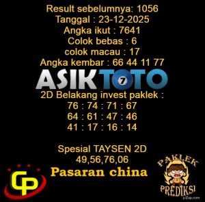 Prediksi Togel Asiktoto China 23 Desember 2025. adalah salah satu motode peracikan angka togel melalui rumus dari para master prediksi yang ada. Prediksi togel membantu para pecinta permainan togel untuk menebak angka result togel yang akan keluar