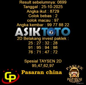 Prediksi Togel Asiktoto China 25 Oktober 2025. adalah salah satu motode peracikan angka togel melalui rumus dari para master prediksi yang ada. Prediksi togel membantu para pecinta permainan togel untuk menebak angka result togel yang akan keluar