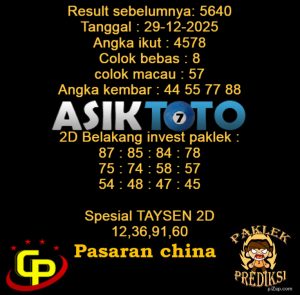 Prediksi Togel Asiktoto China 29 Desember 2025. adalah salah satu motode peracikan angka togel melalui rumus dari para master prediksi yang ada. Prediksi togel membantu para pecinta permainan togel untuk menebak angka result togel yang akan keluar