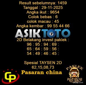 Prediksi Togel Asiktoto China 29 November 2025. adalah salah satu motode peracikan angka togel melalui rumus dari para master prediksi yang ada. Prediksi togel membantu para pecinta permainan togel untuk menebak angka result togel yang akan keluar