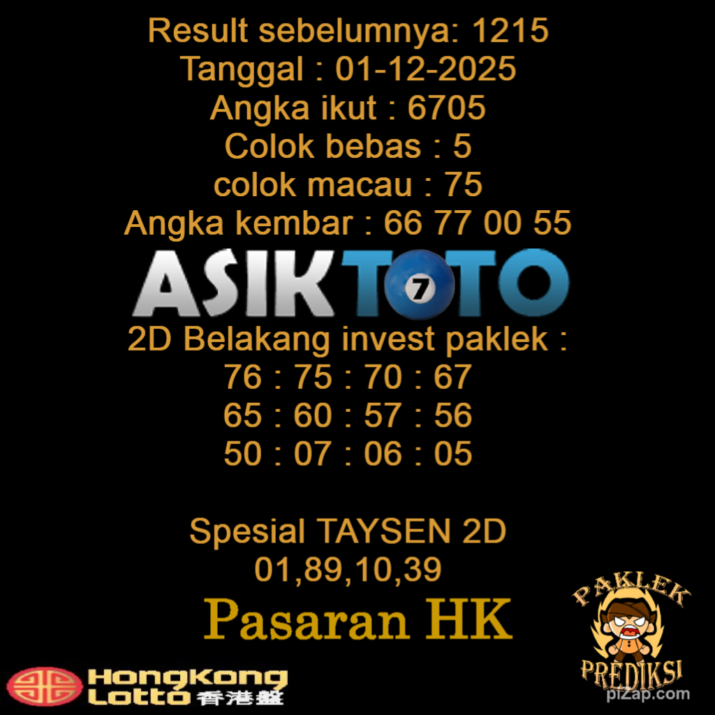 Prediksi Togel Asiktoto Hari Ini Hongkonglotto 01 Desember 2025. adalah salah satu motode peracikan angka togel melalui rumus dari para master prediksi yang ada. Prediksi togel membantu para pecinta permainan togel untuk menebak angka result togel yang akan keluar