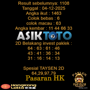 Prediksi Togel Asiktoto Hari Ini Hongkonglotto 04 Desember 2025. adalah salah satu motode peracikan angka togel melalui rumus dari para master prediksi yang ada. Prediksi togel membantu para pecinta permainan togel untuk menebak angka result togel yang akan keluar
