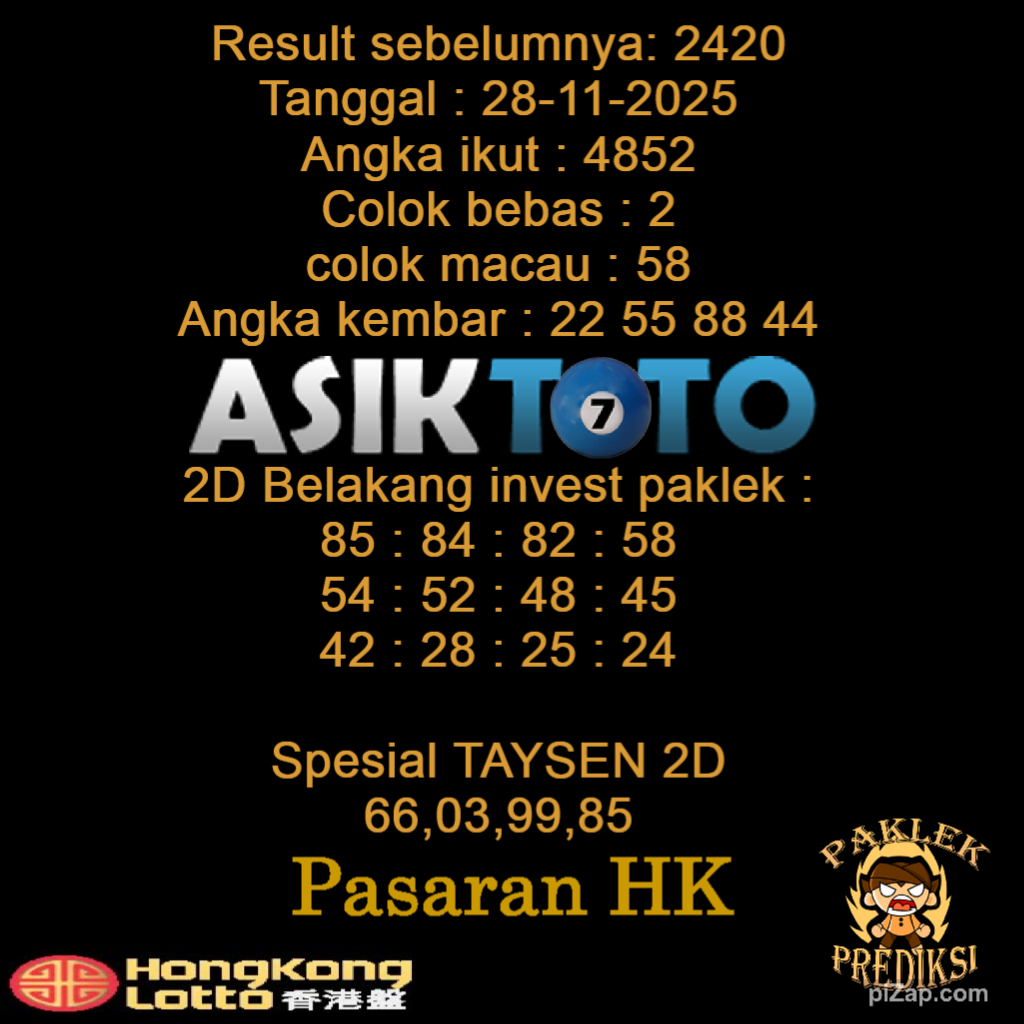 Prediksi Togel Asiktoto Hari Ini Hongkonglotto 28 November 2025. adalah salah satu motode peracikan angka togel melalui rumus dari para master prediksi yang ada. Prediksi togel membantu para pecinta permainan togel untuk menebak angka result togel yang akan keluar
