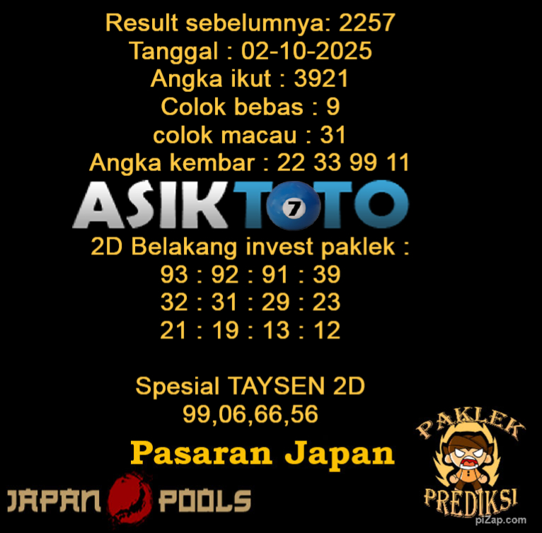 Prediksi Togel Asiktoto Japan 02 Oktober 2025. adalah salah satu motode peracikan angka togel melalui rumus dari para master prediksi yang ada. Prediksi togel membantu para pecinta permainan togel untuk menebak angka result togel yang akan keluar.