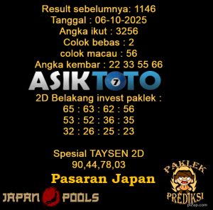 Prediksi Togel Asiktoto Japan 06 Oktober 2025. adalah salah satu motode peracikan angka togel melalui rumus dari para master prediksi yang ada. Prediksi togel membantu para pecinta permainan togel untuk menebak angka result togel yang akan keluar.