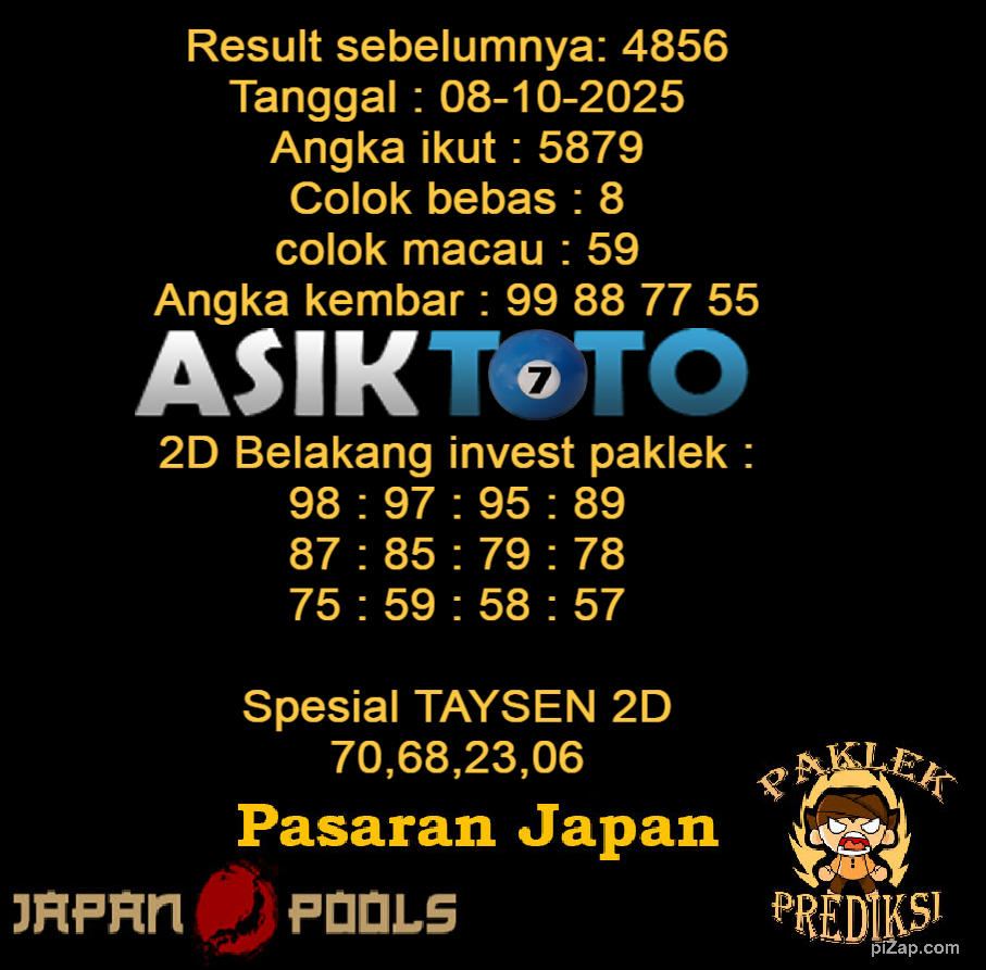 Prediksi Togel Asiktoto Japan 08 Oktober 2025. adalah salah satu motode peracikan angka togel melalui rumus dari para master prediksi yang ada. Prediksi togel membantu para pecinta permainan togel untuk menebak angka result togel yang akan keluar.