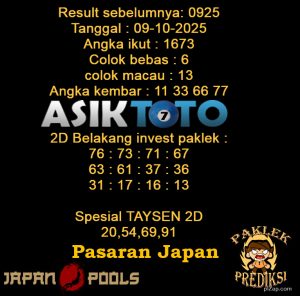 Prediksi Togel Asiktoto Japan 09 Oktober 2025. adalah salah satu motode peracikan angka togel melalui rumus dari para master prediksi yang ada. Prediksi togel membantu para pecinta permainan togel untuk menebak angka result togel yang akan keluar.
