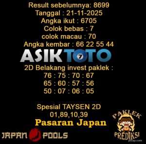 Prediksi Togel Asiktoto Japan 21 November 2025. adalah salah satu motode peracikan angka togel melalui rumus dari para master prediksi yang ada. Prediksi togel membantu para pecinta permainan togel untuk menebak angka result togel yang akan keluar.