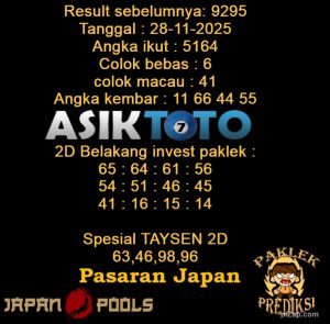 Prediksi Togel Asiktoto Japan 28 November 2025. adalah salah satu motode peracikan angka togel melalui rumus dari para master prediksi yang ada. Prediksi togel membantu para pecinta permainan togel untuk menebak angka result togel yang akan keluar.