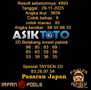 Prediksi Togel Asiktoto Japan 29 November 2025. adalah salah satu motode peracikan angka togel melalui rumus dari para master prediksi yang ada. Prediksi togel membantu para pecinta permainan togel untuk menebak angka result togel yang akan keluar.