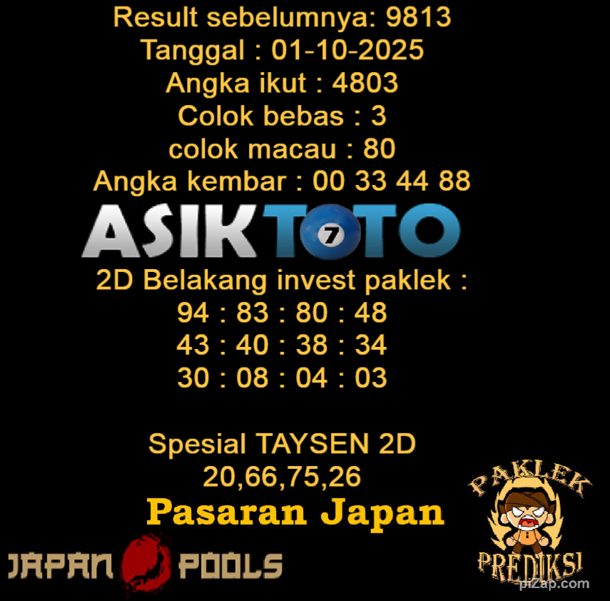 Prediksi Togel Asiktoto Japan 01 Oktober 2025. adalah salah satu motode peracikan angka togel melalui rumus dari para master prediksi yang ada. Prediksi togel membantu para pecinta permainan togel untuk menebak angka result togel yang akan keluar.