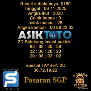 Prediksi Togel Asiktoto Singaporepools 06 November 2025. adalah salah satu motode peracikan angka togel melalui rumus dari para master prediksi yang ada. Prediksi togel membantu para pecinta permainan togel untuk menebak angka result togel yang akan keluar.