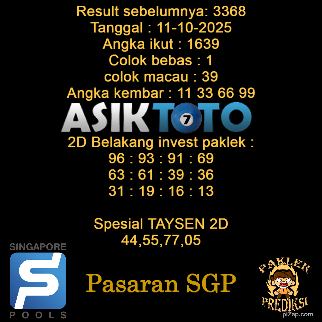 Prediksi Togel Asiktoto Singaporepools 11 Oktober 2025. adalah salah satu motode peracikan angka togel melalui rumus dari para master prediksi yang ada. Prediksi togel membantu para pecinta permainan togel untuk menebak angka result togel yang akan keluar.