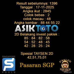 Prediksi Togel Asiktoto Singaporepools 17 November 2025. adalah salah satu motode peracikan angka togel melalui rumus dari para master prediksi yang ada. Prediksi togel membantu para pecinta permainan togel untuk menebak angka result togel yang akan keluar.