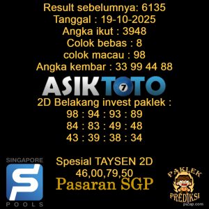Prediksi Togel Asiktoto Singaporepools 19 Oktober 2025. adalah salah satu motode peracikan angka togel melalui rumus dari para master prediksi yang ada. Prediksi togel membantu para pecinta permainan togel untuk menebak angka result togel yang akan keluar.