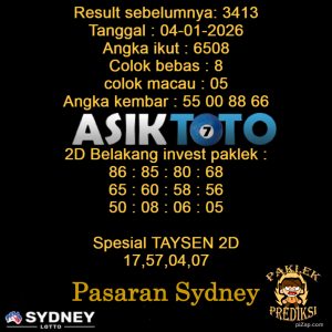 Prediksi Togel Asiktoto Sydneylotto 04 Januari 2026. adalah salah satu motode peracikan angka togel melalui rumus dari para master prediksi yang ada. Prediksi togel membantu para pecinta permainan togel untuk menebak angka result togel yang akan keluar.