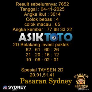 Prediksi Togel Asiktoto Sydneylotto 04 November 2025. adalah salah satu motode peracikan angka togel melalui rumus dari para master prediksi yang ada. Prediksi togel membantu para pecinta permainan togel untuk menebak angka result togel yang akan keluar.