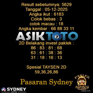 Prediksi Togel Asiktoto Sydneylotto 05 Desember 2025. adalah salah satu motode peracikan angka togel melalui rumus dari para master prediksi yang ada. Prediksi togel membantu para pecinta permainan togel untuk menebak angka result togel yang akan keluar.