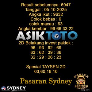Prediksi Togel Asiktoto Sydneylotto 05 Oktober 2025. adalah salah satu motode peracikan angka togel melalui rumus dari para master prediksi yang ada. Prediksi togel membantu para pecinta permainan togel untuk menebak angka result togel yang akan keluar.