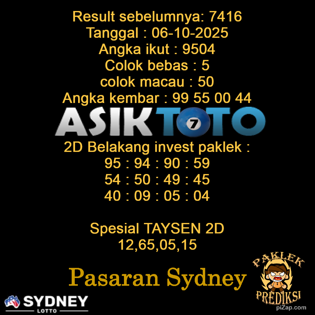 Prediksi Togel Asiktoto Sydneylotto 06 Oktober 2025. adalah salah satu motode peracikan angka togel melalui rumus dari para master prediksi yang ada. Prediksi togel membantu para pecinta permainan togel untuk menebak angka result togel yang akan keluar.