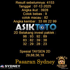 Prediksi Togel Asiktoto Sydneylotto 07 Desember 2025. adalah salah satu motode peracikan angka togel melalui rumus dari para master prediksi yang ada. Prediksi togel membantu para pecinta permainan togel untuk menebak angka result togel yang akan keluar.