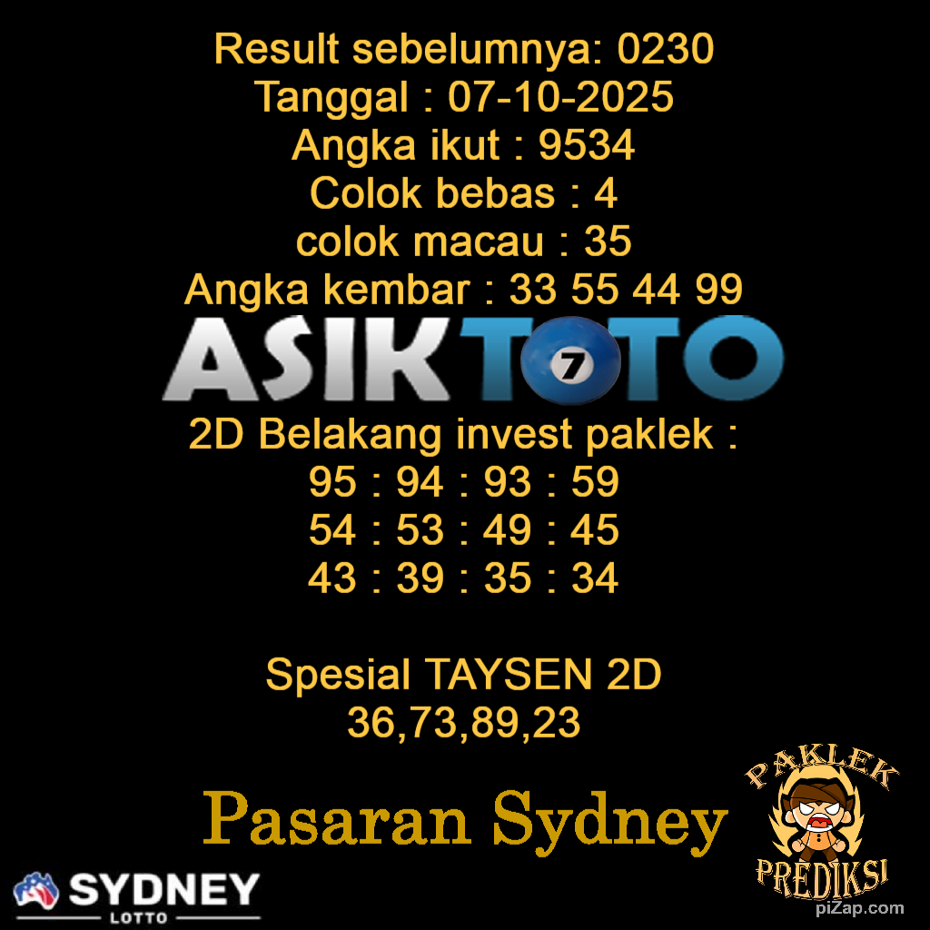 Prediksi Togel Asiktoto Sydneylotto 07 Oktober 2025. adalah salah satu motode peracikan angka togel melalui rumus dari para master prediksi yang ada. Prediksi togel membantu para pecinta permainan togel untuk menebak angka result togel yang akan keluar.