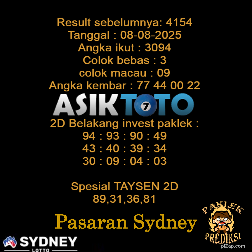 Prediksi Togel Asiktoto Sydneylotto 08 Agustus 2025. adalah salah satu motode peracikan angka togel melalui rumus dari para master prediksi yang ada. Prediksi togel membantu para pecinta permainan togel untuk menebak angka result togel yang akan keluar.