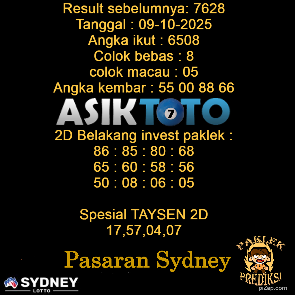 Prediksi Togel Asiktoto Sydneylotto 09 Oktober 2025. adalah salah satu motode peracikan angka togel melalui rumus dari para master prediksi yang ada. Prediksi togel membantu para pecinta permainan togel untuk menebak angka result togel yang akan keluar.