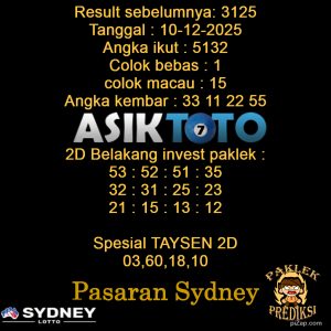 Prediksi Togel Asiktoto Sydneylotto 10 Desember 2025. adalah salah satu motode peracikan angka togel melalui rumus dari para master prediksi yang ada. Prediksi togel membantu para pecinta permainan togel untuk menebak angka result togel yang akan keluar.