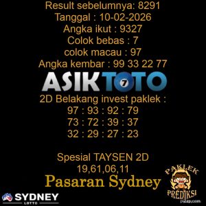 Prediksi Togel Asiktoto Sydneylotto 10 Februari 2026. adalah salah satu motode peracikan angka togel melalui rumus dari para master prediksi yang ada. Prediksi togel membantu para pecinta permainan togel untuk menebak angka result togel yang akan keluar.