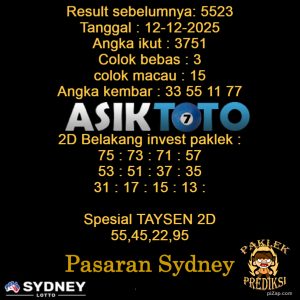 Prediksi Togel Asiktoto Sydneylotto 12 Desember 2025. adalah salah satu motode peracikan angka togel melalui rumus dari para master prediksi yang ada. Prediksi togel membantu para pecinta permainan togel untuk menebak angka result togel yang akan keluar.
