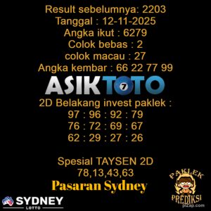 Prediksi Togel Asiktoto Sydneylotto 12 November 2025. adalah salah satu motode peracikan angka togel melalui rumus dari para master prediksi yang ada. Prediksi togel membantu para pecinta permainan togel untuk menebak angka result togel yang akan keluar.