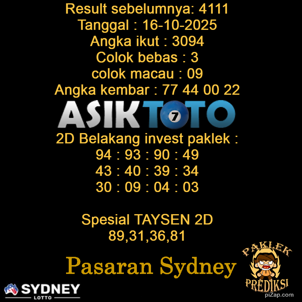 Prediksi Togel Asiktoto Sydneylotto 16 Oktober 2025. adalah salah satu motode peracikan angka togel melalui rumus dari para master prediksi yang ada. Prediksi togel membantu para pecinta permainan togel untuk menebak angka result togel yang akan keluar.