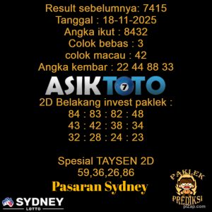 Prediksi Togel Asiktoto Sydneylotto 18 November 2025. adalah salah satu motode peracikan angka togel melalui rumus dari para master prediksi yang ada. Prediksi togel membantu para pecinta permainan togel untuk menebak angka result togel yang akan keluar.