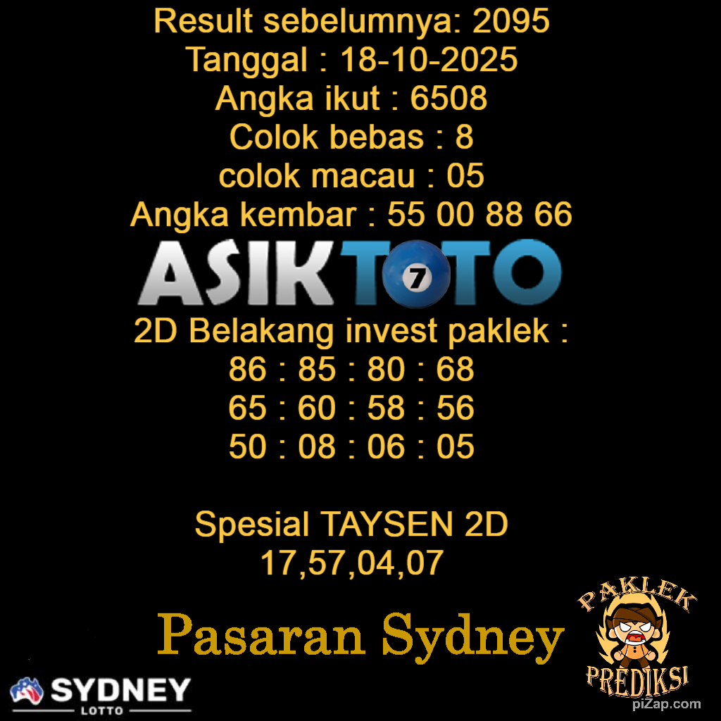 Prediksi Togel Asiktoto Sydneylotto 18 Oktober 2025. adalah salah satu motode peracikan angka togel melalui rumus dari para master prediksi yang ada. Prediksi togel membantu para pecinta permainan togel untuk menebak angka result togel yang akan keluar.