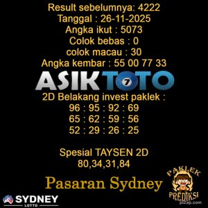 Prediksi Togel Asiktoto Sydneylotto 26 November 2025. adalah salah satu motode peracikan angka togel melalui rumus dari para master prediksi yang ada. Prediksi togel membantu para pecinta permainan togel untuk menebak angka result togel yang akan keluar.