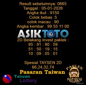 Prediksi Togel Asiktoto Taiwan 05 Januari 2026. adalah salah satu motode peracikan angka togel melalui rumus dari para master prediksi yang ada. Prediksi togel membantu para pecinta permainan togel untuk menebak angka result togel yang akan keluar.