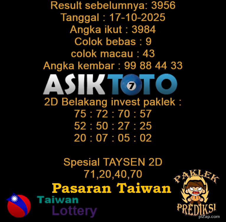 Prediksi Togel Asiktoto Taiwan 17 Oktober 2025. adalah salah satu motode peracikan angka togel melalui rumus dari para master prediksi yang ada. Prediksi togel membantu para pecinta permainan togel untuk menebak angka result togel yang akan keluar.
