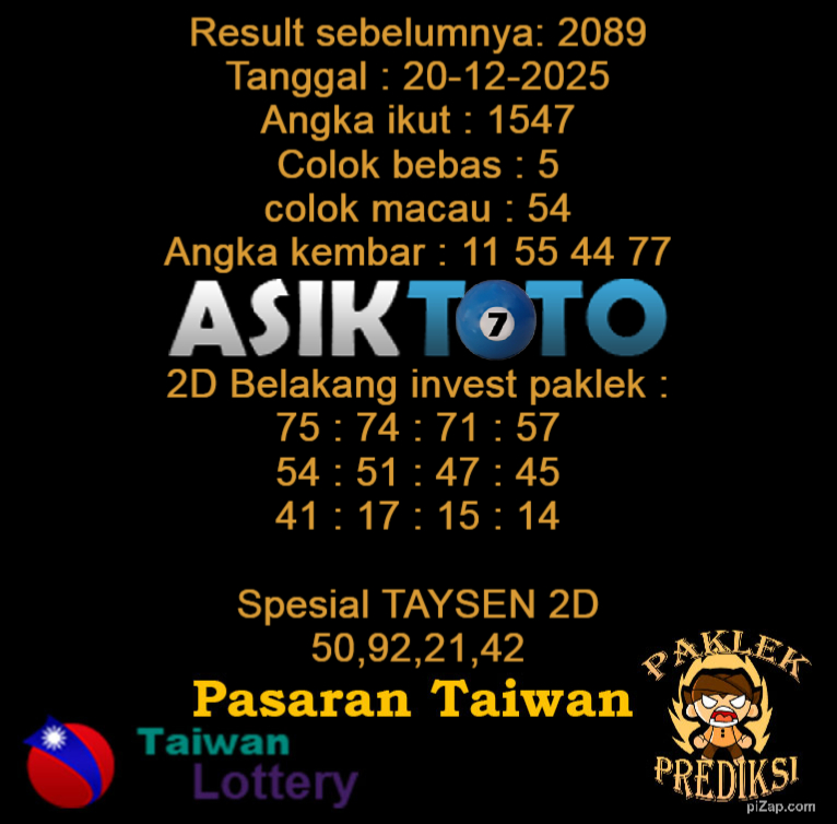 Prediksi Togel Asiktoto Taiwan 20 Desember 2025. adalah salah satu motode peracikan angka togel melalui rumus dari para master prediksi yang ada. Prediksi togel membantu para pecinta permainan togel untuk menebak angka result togel yang akan keluar.
