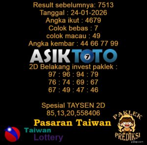 Prediksi Togel Asiktoto Taiwan 24 Januari 2026. adalah salah satu motode peracikan angka togel melalui rumus dari para master prediksi yang ada. Prediksi togel membantu para pecinta permainan togel untuk menebak angka result togel yang akan keluar.