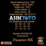 Prediksi Togel Asiktoto Hari Ini Hongkonglotto 04 Januari 2026. adalah salah satu motode peracikan angka togel melalui rumus dari para master prediksi yang ada. Prediksi togel membantu para pecinta permainan togel untuk menebak angka result togel yang akan keluar PREDIKSI HONGKONG ASIKTOTO HARI INI Result sebelumnya: 1782 Tanggal : 04-01-2026 Angka ikut : 9321 […]