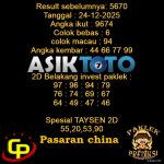 Prediksi Togel Asiktoto China 25 Desember 2025. adalah salah satu motode peracikan angka togel melalui rumus dari para master prediksi yang ada. Prediksi togel membantu para pecinta permainan togel untuk menebak angka result togel yang akan keluar PREDIKSI CHINA ASIKTOTO HARI INI Result sebelumnya: 9091 Tanggal : 25-12-2025 Angka ikut : 1872 Colok bebas […]